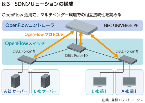 兼松エレクトロニクスは、SDNを「ばらまく」仕組みをつくることによって、導入のハードルが高いとみられる中堅企業にSDNの採用を促す。SDNのコア技術であるOpenFlowに対応したNECのコントローラとデルのスイッチを活用し、ネットワークを仮想化する(図3参照)。マルチベンダー環境で相互接続性が高まることを訴求し、今年度(2015年3月期)中に、10社への納入を目指す。