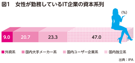 IT業界での女性活用について調査を行った独立行政法人の情報処理推進機構(IPA)によると、女性社員の比率が最も高いのは、独立系のIT企業(47%、図1参照)である。業務内容については、システム開発のエンジニア・プログラマが36%と最も多く、営業・マーケティング(10%)と運用・管理(9%)がそれに次いで多い。