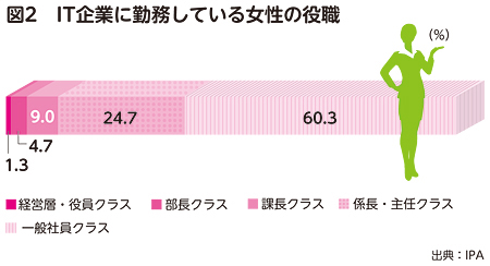 国が促進している「女性活用」に関して、IT企業で問題になっているのは、部下を抱えたり、意思決定に関わったりするなど、リーダー役を果たす女性管理職がほとんどいないということだ。IPAは、IT企業に勤務している女性の大半(60.3%)が一般社員クラスだとみている。部長(4.7%)クラスや、経営層・役員クラス(1.3%)に属して、ビジネスへの大きな影響力をもつ女性はまだ少数派というわけだ(図2参照)。