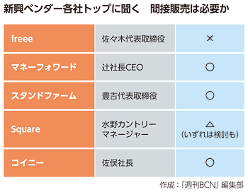 実は、この特集で取材したベンダー各社トップの多くも、アーリーマジョリティ、レイトマジョリティと順にアプローチしてユーザーの数を継続的に増やしていくには、いずれ何らかの間接販売ルートが必要になると考えていて、それをどう構築するか悩んでいる。例外は、freeeの佐々木代表取締役だ。佐々木代表取締役は、5年で100万ユーザー獲得という目標を達成するには、「オンラインを徹底していくことこそが重要」と言い切る。「人が売る」というビジネスモデルは、当然ながらコスト効率を低下させる。「最初からレイトマジョリティにアプローチしたら失敗するだろうが、順番を間違えずに訴求していけば、ユーザーがユーザーを呼び、どんどん波及しながら浸透していくという流れが出てくるだろう。適正価格で売り続けるためにも、これは重要なこと」(佐々木代表取締役)だと判断している。