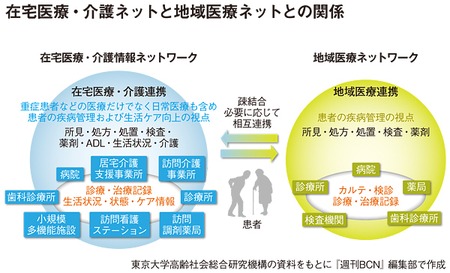 ●医療ネットとの親和性は低い 「在宅医療・介護情報ネットワーク」は、厚生労働省の「地域包括ケアシステム」の考え方に沿ったもので、医師や薬剤師、看護師、介護士、家族など、高齢者の在宅医療・介護に必要な人材や組織をネットワークで結ぶ仕組みだ。ここで重要なポイントは、前出の「地域医療ネットワーク」とは、別のネットワークを在宅医療・介護のために構築するという点である。