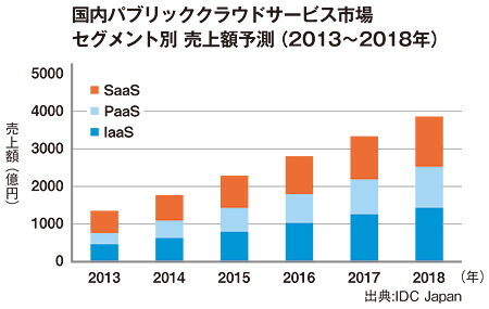●キャパシティではAWSより優位 初年度は、売上1億円を目標としているが、その7割程度はIaaSの「Google Compute Engine」が占めると予測している。IDC Japanの調査によれば、パブリッククラウドの市場は、2018年には2013年の3倍の4000億円規模になり、なかでもIaaSの伸びが大きい(図参照)。この成長領域を重点的に攻めるわけだが、一方で、IaaS/PaaS領域では、AWSが日本でも圧倒的なシェアを誇り、彼らと真正面からぶつかったうえで、案件を獲得しなければならない。