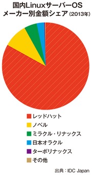 ●レッドハットが圧倒的なシェア Ubuntuなど新興勢力にも注目 サーバーOSのなかではLinux市場が最も成長率が高いとみられており、Linuxを提供するメーカーにとっては、大きなビジネスチャンスといえる。IDC Japanの調査によれば、メーカー別金額シェアで圧倒的な地位を築いているのはレッドハットだ。2013年の時点で83.2%のシェアを確保している。これは、「OEMをメインのビジネスとしているからだ」と、入谷シニアマーケットアナリストは説明する。