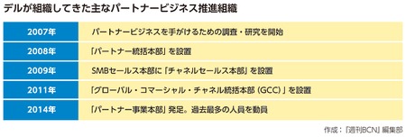 それからのデルは、少しずつパートナーという言葉を使うようになった。この約7年、デルはいくつかのチャネル専門部隊をつくり(表参照)、パートナービジネスを推進。直近でいえば「グローバル・コマーシャル・チャネル統括本部(GCC)」がそれである。組織が変わって、トップを務める人も変わった。紆余曲折を経て、全売上高のなかでパートナービジネスが占める割合を、約30%まで高めたのである。