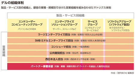 パートナー事業本部を組織して新たに生まれた組織は図の通りだ。以前から敷いている製品・サービス別の組織と、顧客の業種・規模別で分けた営業組織を組み合わせたマトリクス体制である。以前の組織と比較して製品・サービス別組織に変更はない。営業組織にパートナー事業本部を組織し、加えて西日本エリアを専門に営業展開する新組織をつくったのが、今回の新しい動きだ。