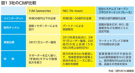 国産大手のクラウドマーケットプレイスは、三者三様で、メインターゲットがわずかずつ重なりながらも、品揃えの方針やチャネル戦略に明確な違いがみられる(図1参照)。自社にとっての新たなマーケットに、直販を基本として、「紹介手数料」というライトな仕組みで幅広い拡販チャネルを構築しようとするFJMに対して、パートナー販売のスキームは守りながら、それを何とかクラウドビジネスに適応させようとしているNEC。日立システムズは、その中間で方針を模索中といった印象だ。