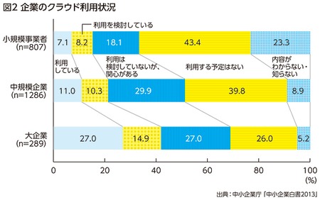 SMBにとってクラウドはメリットがあるといわれて久しいが、企業の規模が小さくなればなるほど、クラウド導入への意欲が乏しい状況は変わっていない(図2参照)。freeeをはじめとする新興のITベンチャーは、精緻なマーケティングを基に、まずはクラウド導入に抵抗のないイノベータやアーリーアダプタ企業に絞って製品を訴求し、短期間で多くのユーザーを獲得することに成功している。しかし、国産大手ベンダーの顧客はそうした企業ではない。3社のマーケットプレイス事業担当者が口を揃えるのは、「今は競合と争うよりも、協力して市場をつくることが大事」ということ。本来レイトマジョリティに属するようなユーザーにいきなりクラウド商材を提案することの難しさをどう乗り越えるのか、明確な答えはまだみえない。一方で、セールスフォース・ドットコムのAppExchangeは、パートナーのコミュニティとして機能し、同社のPaaSビジネスの拡大に向けたエンジンになっている。国産ベンダー3社とは目指すものが違うにせよ、SaaSビジネスの拡大において、PaaS戦略が大きな役割を果たすことを証明しているのも事実。この領域で、国産ベンダーの存在感が薄いのは気になるところだ。