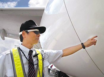 Google Glassを装着したJALの整備士(NRIとJALの広報資料から引用)