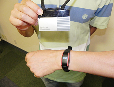 ●組織の可視化ツールで威力 ビジネス顕微鏡は、これまで経験的、感覚的にしかわからなかった事象の可視化に成功している。例えば、M&A(企業の合併・買収)や組織再編で複数の会社や組織が統合したとする。旧会社や旧組織の従業員がどのようにコミュニケーションを図っているのかを可視化し、当初の計画通りに融合が進んでいるのかを測定するというものだ。首からさげた社員証型の端末には、赤外線や加速度、社内のどこにいるのかを測定するビーコンなどのセンサを組み合わせて、コミュニケーションの量や質を測定する。