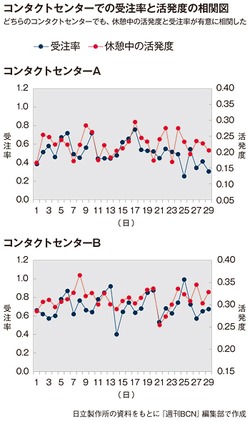 電話でセールスをするアウトバウンド型のコンタクトセンターでの事例では、組織の「活発度」と「受注率」に有意な差があることを証明している。「活発度」とは休憩時間などでスタッフ同士が活発にコミュニケーションしているかどうかで、活発であれば「受注率」が上がるというものだ。事例によっては2割ほど受注率が上がったケースもある。コミュニケーションの内容は、他愛もない世間話でも十分で、内容よりも、むしろ「和やかな雰囲気」(渡邊主任研究員)が大切だという。