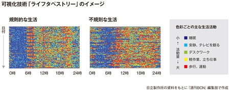 日立製作所中央研究所の渡邊純一郎主任研究員(左)と日立システムズの栗山裕之主任研究員 ライフ顕微鏡は、腕時計型ウェアラブル端末に加速度センサなどを組み込んだもので、睡眠や安静、デスクワーク、軽作業、運動などを測定する。いわゆる“ライフログ”的なものであり、同社が独自に開発した可視化技術「ライフタペストリー」(図参照)によって、その人の生活習慣を可視化するものだ。一方、ビジネス顕微鏡は、社員証のような名札型のウェアラブル端末で、首にかけて使う。各種センサによって、誰と誰がどこで会って、どのくらいの時間にわたって話をしたのかなどを記録。組織の人間関係や活発度を可視化するものだ。