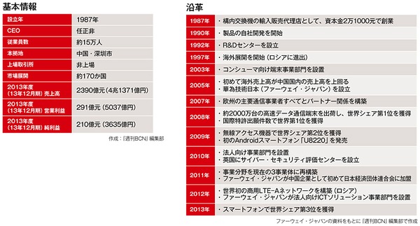 ファーウェイの設立は87年。スイッチやルータなど、通信事業者向けのネットワークインフラ構築ビジネスに端を発している。これまでにグローバルの主要通信事業者50社のうち45社がファーウェイのネットワークインフラを活用していて、近年急速に普及している商用LTEネットワークでは、すでにグローバルで約300件の受注実績を積み上げた。通信事業者向け事業は、ファーウェイの根幹ビジネスとして大きく成長し、13年度には売上高の約70%を占める1665億元(2兆8821億円)までに拡大している。