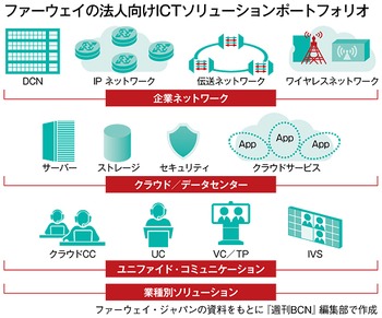 徐直軍・取締役副会長 法人向けICTソリューション事業は11年に本格始動したばかりだが、すでに豊富なラインアップを取り揃えている。ネットワーク関連ではルータやスイッチ、セキュリティ、クラウド/DC(データセンター)関連ではサーバーやストレージ、ユニファイドコミュニケーション(UC)関連ではビデオ会議システム、さらに、業界別ソリューションも提供している。