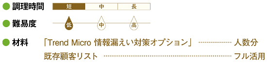 ●調理法 レシピ2は、トレンドマイクロの法人向けセキュリティ「ウイルスバスター コーポレートエディション」に追加するオプション製品だ。デバイスコントロール機能を備えて、許可されていないUSBメモリの使用を禁止するだけでなく、USBメモリに記録しているデータの持ち出しを監視して、コピーを禁じることができる。