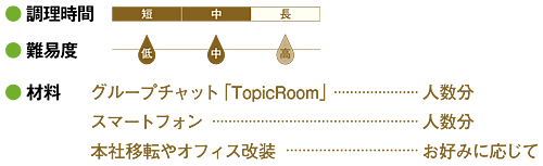 ●調理法 NTTソフトウェアが販売を手がける「TopicRoom」は、ビジネス活用に適したグループチャットのツールだ。管理者に許可された関係者に限定して、チャットのやり取りを行うことができる。