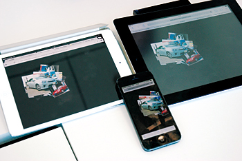 写真1 WebSocketの活用例。オークネットが試験的に開発した写真を操作するウェブアプリ。ある端末で写真を動かすと、すべての端末の画面にリアルタイムで反映する。すべての端末で同時に操作することもできる