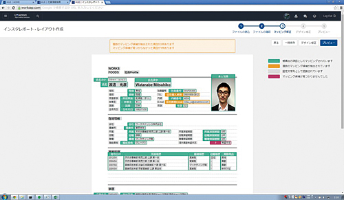 例えば、各種台帳や帳票、レポート類は、最初からテンプレートが用意されているが、社内でこれまで使ってきた雛形に当てはめたいというユーザーも多いだろう。HUEは、ExcelやPDFでつくった既存のデータをサンプルとして取り込むと、レイアウト情報を読み取り、ファイル内のどの情報がDB上のどの項目・情報とリンクするのか自動で解析してレポート上にマッピングする。この機能を「マジックインポート」と呼んでいる。
