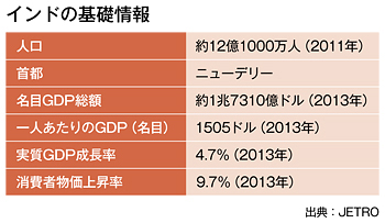 インドは紛れもなく成長市場である。しかし、中国やASEAN主要国のような消費市場を形成しているかといえば、必ずしもそうではない。日本貿易振興機構(JETRO)の調査によると、インドの2013年の一人あたりのGDP(名目)はドル換算で1505ドル。GDP(名目)が3000ドルを超えると消費市場が急速に拡大するという定説を踏まえれば、まだまだという印象は拭えない。隣のASEANをみると、同地域最大国のインドネシアが同3510ドルで存在感を急速に増している。ASEAN主要国を構成するタイが同5000ドル超え、マレーシアが同1万ドル超えである。