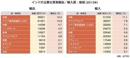 ●ASEANや中東との接点 二つ目は「ASEANや中東との相互補完の関係」である。イギリス連邦(英連邦)に加盟するインドは、同じく同連邦のメンバー、ASEAN主要国でもあるマレーシアやシンガポールと関係が深い。実際、マレーシアやシンガポールで活躍するインド系ITベンダーは多く、日立システムズの高橋直也社長も「インドとASEANの関わりは深い」と認めるところだ。さらに、日系ITベンダーがほとんど進出できていない中東市場との接点が多いのもインドの特徴である。インドの主要な貿易輸出入国をみるとアラブ首長国連邦(UAE)やサウジアラビアなどの中東国が上位に名を連ねていて、インドとの関わりの深さがうかがえる。CAC Holdingsグループのアクセルフロントラインも、ドバイ(UAE)に主要拠点を置いている。