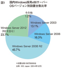 調査会社のIDC Japanが14年12月4日に発表した資料によると、国内のWindows Server 2003採用サーバーは、14年末で約21万台。Windowsサーバー全体のうち13.1%のシェアとなる(図1)。ちなみに、最新バージョンの「Windows Server 2012」(R2を含む)のシェアは、23.7%である。その数字を勘案すれば、Windows Server 2003のシェアは決して大きくはない。とはいえ、約21万台が稼働していて、そのリプレース案件が残っている。