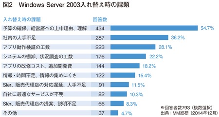 調査会社のMM総研によると、Windows Server 2003のリプレース時の課題として、三つの比率が高かったという(図2)。一つ目は「予算の確保、経営陣の理解」で54.7%。二つ目は「社内の人手不足」で36.2%。三つ目が「アプリ動作検証の工数」で28.1%。この調査は、リプレースの作業中またはリプレースが完了したユーザー企業を対象に「課題は何だったか」をたずねた結果である。これを考慮した最適な提案が、ITベンダーには求められる。
