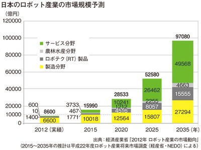 ●将来は、ロボット産業の主役に 実は、こうした対話型ロボット(サービス系ロボット)分野は、現在は市場規模が小さいものの、成長率は工場などで用いられる産業系ロボット(製造分野)よりもはるかに高い。経済産業省のレポート(2013年7月発表)によれば、サービス系ロボット市場は、2035年に4兆9568億円に達する見通しで、2015年に比べて約13倍伸びる。一方、現在主役の製造系ロボットは、2035年は2兆7294億円で2015年に比べて約2.7倍。サービス系ロボットのなかでも、介護・福祉施設向けの需要が高まる見込み。高齢者向けサービス事業において、ロボットが入り込む余地が大きそうだ。
