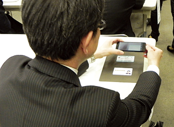 そこでNTTデータでは、電子的にマイナンバーを集めるシステムを開発した。スマートフォンのカメラで10月から通知される番号を記されたカードと、運転免許証など写真付きの本人確認書類を撮影し、これをNTTデータの事務処理センターにオンラインで送るという手法だ。名刺入力や家計簿をつけるために買い物レシートをスマートフォンのカメラで撮ってキーパンチのセンターにオンラインで送る仕組みをイメージするとわかりやすい。すでにNTTデータ社内で実証実験をする段階まで来ている(写真参照)。