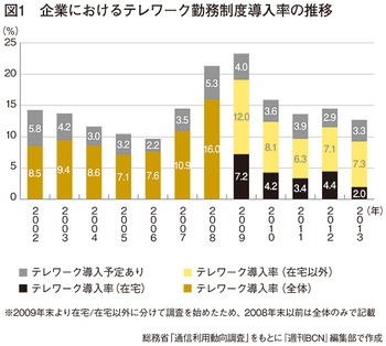 同省の調査によれば、「企業におけるテレワーク勤務制度導入率」は、2009年末の約19%をピークとして、13年末には約9.3%となっている(図1)。同省では「10%前後で推移しており、増加傾向にはあるものの、インターネット普及率やクラウド導入率と比較しても低い状況にある」とコメントしている。