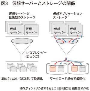 一般的なストレージは、物理サーバーに集約された要求に対してリソースを割り当てる。つまり、物理サーバー上に構築された仮想サーバーの個別要求に対して、最適なリソースを提供する仕組みにはなっていないわけだ。そのため、ある仮想サーバーの負荷が高まっていても、それに対してストレージのリソースを特別に割り当てるようなことはしない。