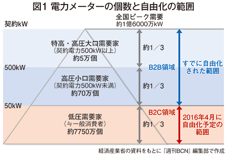 電力小売りの全面自由化は、これまで企業向けの販売(B2B)だけに限られてきた範囲が、一般消費者(コンシューマ)向けの販売(B2C)に拡大することを意味している。経済産業省の資料によれば、電力メーターの設置個数(≒契約件数)ベースで比較すれば、B2B領域は約75万個なのに対して、B2C領域は約7750万個とケタ違いに多い(図1参照)。これをきっかけとして、将来、NTTやソフトバンクのようなグローバル企業が電力の分野から誕生するかもしれない。電力会社は資本力もあり、優秀な人材の宝庫でもあることから、あながち飛躍した論理とは言えないはずだ。