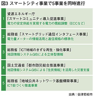 ●まずは情報を「見える化」 ITによる地域再生の準備段階として会津若松市がまず取りかかったのが、情報の「見える化」だ。スマートシティを実現するためには、いかに多種多様な情報を流通させることができるかが大きなポイントになる。原発事故の影響などを受け、震災後、エネルギーマネジメントの高度化に関する補助事業をさまざまな省庁が打ち出した。会津若松市は、これに素早く反応し、役に立ちそうな事業にはどんどん手を上げた。司令塔を務めたのが、市の企画政策部だ。高橋部長は、「もともと個別に進行していた各省庁の事業について、会津若松市が手を上げるかどうかはすべて企画政策部が決め、実際に採択されて事業が立ち上がったら所管の部署に受け渡すというやり方を採った。独立した各省庁の事業を、自分たちのコンセプトに合わせて積極的に活用し、それをスマートシティという大きな流れに市自身でまとめ上げた」と説明する。
