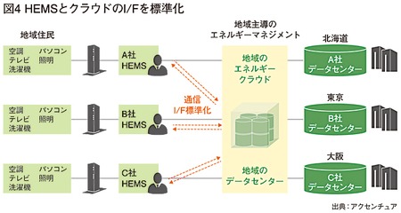 ●地域主導のエネルギー管理 一方で、電力の消費側の見える化も進めている。それが、総務省の「スマートグリッド通信インタフェース事業」だ。2013年3月に、まずは100世帯を対象に実証実験をはじめた。ここで進めたのが、HEMSの通信インターフェースの標準化だ。高橋部長は、「3社のHEMS機器を導入したが、通常、このHEMSデータは各メーカーのデータセンターに送られることになる。しかし、これではリアルタイムにすべてのHEMSのデータを横断的に把握することができず、デマンドレスポンスなどに活用することもできない。そこで、通信規格を標準化して、地域のデータセンターにすべてのHEMSデータを集約するという、地域主導のエネルギーマネジメントができる仕組みを構築している」と説明する(図4参照)。さらに、この推進母体として、地元ITベンチャーやアクセンチュアなどが「会津若松スマートシティ推進協議会」を設立し、プロジェクトマネージャーの役割を果たしている。グローバルベンダーの知恵と地元の産業界の力を結集した同協議会は、いまや、このプロジェクトだけでなく、会津若松市のスマートシティ構想全体の推進役となっている。