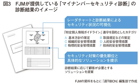 ●社内システムを無料で診断 マイナンバー制度に関連して、ユーザー企業の総務部門に対するコンサルティングや社員へのeラーニングに取り組んでいるFJMは、社内システムの状況をきちんと把握することができるサービスとして「マイナンバーセキュリティ診断」を無償で提供している。