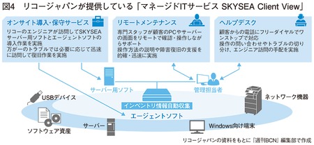 アピールしているのは、フォーティゲートのUTMをベースとした「ゲートウェイセキュリティパック FotiGate」と、SkyのPC資産管理ソフトをベースとした「マネージドITサービス SKYSEA Client View」だ。この二つのパッケージによって、外部脅威の侵入を防止して不正な通信を遮断するという入口・出口対策に加えて、操作ログやクライアントの管理による内部対策も施すことができる。しかも、マネージドサービスのメニューということで、設置や設定、運用・保守などはリコージャパンが行う。とくに、マネージドITサービス SKYSEA Client Viewには、オンサイト導入・保守、リモートメンテナンス、ヘルプデスクなどを提供して資産管理に関わる運用を一括でサポートする。