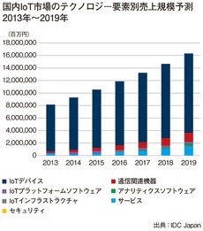 調査会社のIDC Japanによると、2014年の国内IoT市場売上規模は9.4兆円で、2019年には16.4兆円になるという(左のグラフを参照)。内訳としては、2014年では9割近くがIoTデバイスの売り上げとなるが、2019年にはIoTデバイスのコモディティ化が進み、約7割に下がるとのことである。なかでもサービスやセキュリティの比率が上がると予想されることから、SIoTが有望な市場になると解釈することができる。