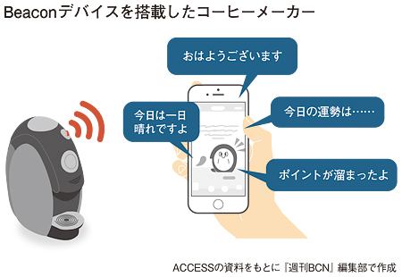 バリスタでの仕組みはこうだ。バリスタには、Beacon(ビーコン)デバイスが装着されていて、それとバリスタユーザー向けスマートフォンアプリ「ネスカフェ アプリ」が連携する。インターネットに接続するのはスマートフォンであって、バリスタをネットワークに接続する必要はない(図を参照)。このシステムを構築したのは、組み込み系などで実績があるACCESSだ。
