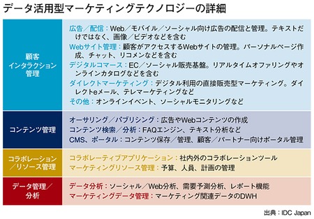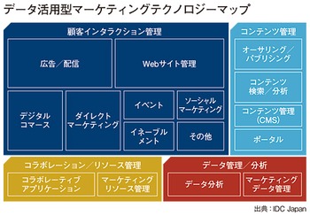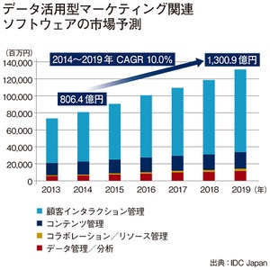 眞鍋敬氏 デジタルマーケティング・ソリューションの市場動向に関するレポートは、まだまだ少ない。市場が黎明期にあって、信頼性のあるデータが取りづらいことも大きな要因だろうが、それ以上に、デジタルマーケティング・ソリューションが包括するテクノロジーの範囲が広く、デジタルマーケティングの市場そのものをどう定義するかについてコンセンサスが形成されていないことが影響しているのではないか。そんななか、調査会社のIDC Japanは、今年3月、デジタルマーケティング・ソリューションを体系化して、「データ活用型マーケティングテクノロジーマップ」(下図参照)として発表したほか、国内市場の推移予測についてもレポートした(下グラフ参照)。2014年の市場規模は806.4億円、年率10%の成長が見込まれ、19年には1300.9億円の市場に成長するとのことで、ITベンダーにとっては決して無視できない市場といえよう。