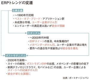 リサーチディレクター トップベンダーの大きな変革により、ERP市場はにわかに活性化してきた感がある。IT分野の調査・コンサルティング会社である米ガートナーは、現在までのERPの進化の歴史を、「古典主義」「モダニズム」「ポストモダニズム」という三つの期間に分類している(詳細は図参照)。ERP市場に詳しいガートナージャパンの本好宏次・エンタープライズ・アプリケーションリサーチディレクターは、「前世代(モダニズム)の主流である一枚岩のERPスイートが、高コストで使いづらくなり、限界がみえてきたなかで、ワークデイやネットスイートといった新興クラウドベンダーが台頭した。しかし、前世代の主役級だったSAPとオラクルも、ここにきてポストモダニズムのニーズを踏まえた製品を新たにつくりあげ、市場に本格投入している。ERP市場はこれから大きく動くだろう」と見通しを語る。
