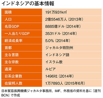 人口が多いだけに、経済規模も大きい。2014年の名目GDPは約8885億ドルと世界16位につけており、タイの約2倍の規模を誇る。同年の経済成長率は5.0%と高い水準を維持。インドネシアでは、就労人口が毎年200万~300万人のペースで増加し続け、人口ボーナス期(総人口に占める生産年齢人口比率が上昇する期間)が2030年まで続くことから、安定的に経済が成長する可能性が高い。
