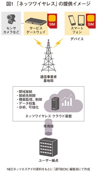 NECネッツエスアイが10月から開始する「ネッツワイヤレス」は、IoTのために設計されたMVNOサービスで、最も安価なプランでは、月間30MB・最大256kbpsで夜間のみ通信可といった制限を加える代わり、1回線あたり月額300円以下という低価格を実現しているのが特徴だ。また、価格以上に充実しているのが法人利用に特化したサービス内容で、インターネットを経由しない閉域接続、宛先・ポート制限通信などの機能が標準で提供される。さらに、NECネッツエスアイのクラウドサービスとして、センサデータの収集・分析などの機能も用意する。