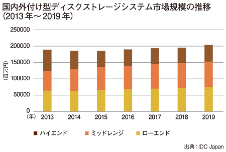 また、IDC Japanによれば14年に導入が進んだモデルは、ミッドレンジ(価格が500万~3000万円未満)とローエンド(同500万円未満)という。ミッドレンジは、仮想化環境やクラウド環境で、高信頼性、高可用性に加えて、最新のストレージ機能(仮想化、重複排除/圧縮、フラッシュ搭載など)を備えながら、コストパフォーマンスが高いとの評価で2ケタ成長を遂げた。ローエンドは、価格がリーズナブルで手軽にリプレースできる点が評価された。このような状況から、IDC Japanでは14年~19年における年間平均成長率(CAGR)がハイエンドでマイナス3.3%とあるが、ミッドレンジで3.2%、ローエンドで3.3%、全体で1.5%のプラスとなり、19年には市場規模が、2008億5500万円規模に達すると予測する。