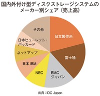 14年時点のメーカー別シェアは、日立製作所が21.0%でトップ、次いで富士通が17.4%、EMCジャパンが14.2%、NECが9.5%、日本IBMが8.4%、ネットアップが7.9%、日本ヒューレット・パッカードが6.7%と続く。各社ともシェア拡大に向けてビジネス強化を図っている。それぞれの取り組みをみていこう。