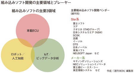 過去を振り返ると、スマホが登場するまでは、「ガラケー(フィーチャーフォン)」「情報家電」「車載情報機器(主にカーナビ)」が三種の神器と呼ばれていた組み込みソフト開発だが、ここ5年あまりで大きく様変わりした。「変化はチャンス」と捉える組み込みソフト開発ベンダーがいる一方で、事業環境の変化に適応しきれていないベンダーも少なくなく、情報サービス業界のなかでも、組み込みソフトビジネスは最も変化が大きく、勢力図も目まぐるしく移り変わる領域の一つであるのだ。