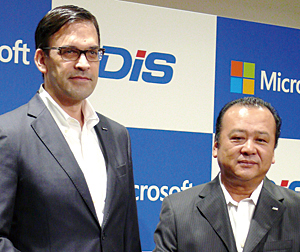 日本マイクロソフトの平野拓也社長(左)とダイワボウ情報システムの安永達哉専務