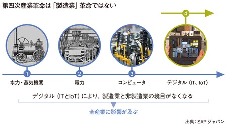 ただし、重要なのは、何回目の産業革命かというよりも、何が起きるのかをしっかりと捉えることである。ちなみに、SAPではインダストリー4.0を「製造業革命ではない」としている。ITが基幹産業として今後も発展していくことを考えると、「全産業に影響が及ぶ」とするのは正論といえるだろう。