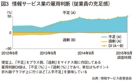 ●過去最高水準の人手不足感 人手不足が続くなか、直近の情報サービス産業協会(JISA)のDI値(将来見通し,雇用判断)によれば、従業員の不足感が過去最高水準の状態にある(図3参照)。ソフトウェア開発を含むエンジニア派遣を手がけるメイテックは、本体の上期(15年4月~9月期)エンジニア稼働率が96%と高水準が続いている。優秀な人材の確保も困難な状態で、とりわけ即戦力になる「中途の採用環境は過熱状態」(メイテックの國分秀世社長)が続いていると話す。