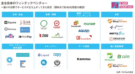 代表取締役 フィンテックと一口にいっても、非常に広い範囲の業務をカバーしているわけだが、協会としては、八つの分野に分けて市場を定義し、ほぼすべての分野でベンチャーのビジネスが立ち上がってきているとみている(図参照)。これを踏まえ、当面の具体的な活動として、「個人資産管理・会計」「決済・送金」「セキュリティ」「投資・融資」「法令・コンプライアンス」の五つの分科会で、現状の課題を抽出していく。