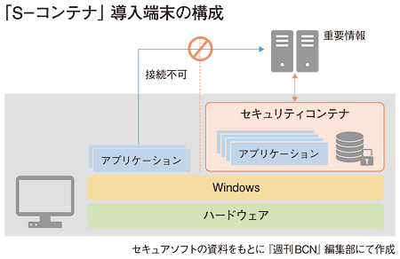 ●端末内を二つに分けるコンテナソリューション 重要情報の取り扱いとインターネットアクセスの両方を同じ環境で行うことが問題ならば、1台の端末のなかにセキュリティレベルの異なる二つの領域を設けてしまえばよい。セキュアソフトが来年の提供開始に向けて準備を進めている「S-コンテナ」は、このような考え方でつくられたソリューションだ。