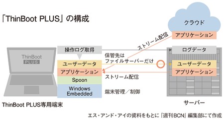 ThinBoot PLUSでは、端末側のOSとしては組み込み版のWindowsである「Windows Embedded」を採用する。Windows Embeddedは、ストレージの状態を固定して書き込み禁止にする機能を備えているので、これを利用することで端末上へのデータの保存や、マルウェアによるシステムの不正な書き換えを防ぐことができる。