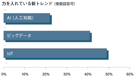 現在、新トレンドの売上比率は、1ケタ前半と、まだビジネスの柱になっていないというのが事実。しかし、「IoT」によって、非IT機器をネットワークでつなぐという新たな潮流が出てきて、センサの開発や提供など新たなビジネスが生まれ始めている。実際、半数近くのITベンダーが「IoT」と回答している。また、IoTが普及すれば、蓄積した膨大なデータを分析するという「ビッグデータ」の活用が生まれる。その分析にAIを使うという取り組みも出てくる。そのため、「IoT」「ビッグデータ」「AI」ともに力を入れると回答するITベンダーも多かった。